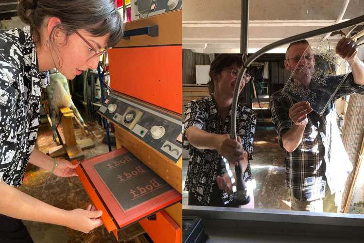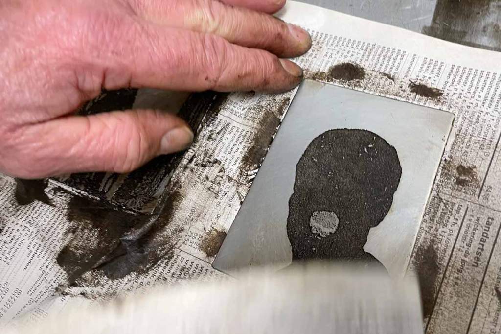 Daniël tijdens het afdrukken van 1 van de 3 etsen voor in het Elegie boekje.