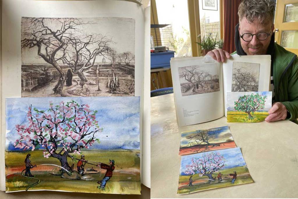Zie links de getekende boom van Vincent Van Gogh met de bloeiende variant, en rechts Daniël en zijn serie illustraties.