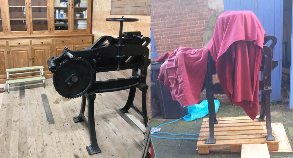 We hadden hem al zien staan, verstild in een vergeten hoek van een donkere kelder. ‘Iets voor jullie Rode schuur..?’ had Aad gevraagd. Aad is een van de laatste Nederlandse lithodrukkers die nog actief is. De kelder waar het ‘het’ stond is de thuisbasis van zijn Basement Press in Diepenheim. We waren daar destijds om het wonder van de lithografie te (her)ontdekken. ‘Ach nee Aad, wat moeten we ermee en wat is het eigenlijk? Het bleek een gietijzeren stapelsnijder uit 1906. Je kunt er grote stapels papier mee snijden. We knikten beleefd en gingen verder met onze bezigheden.