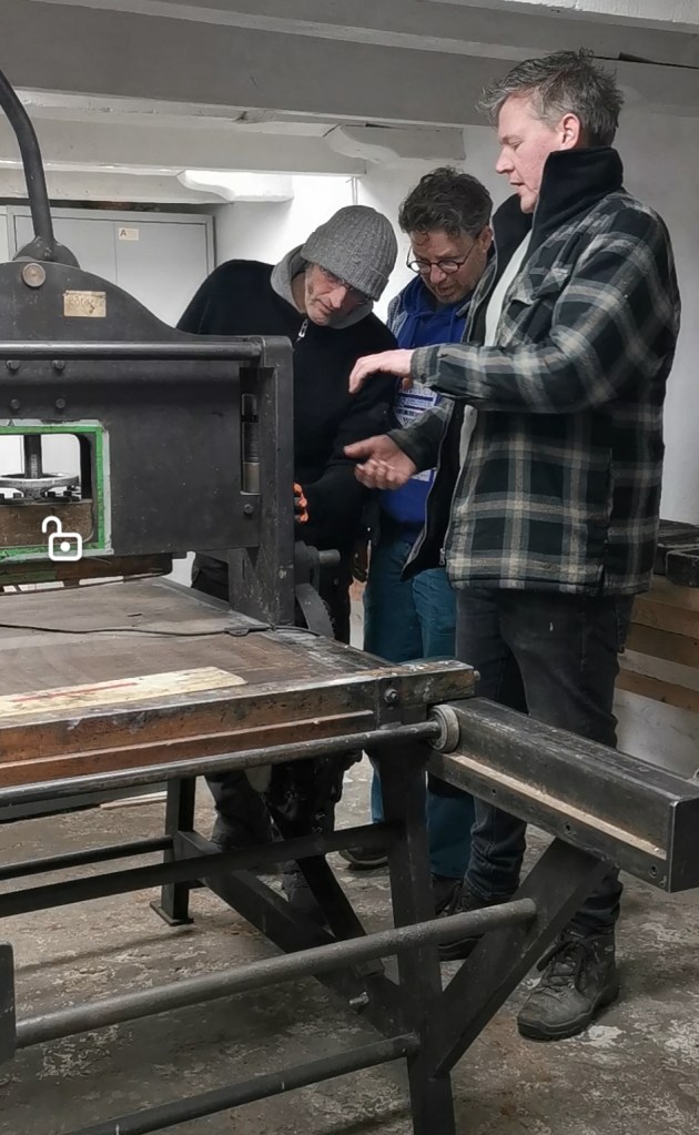 Na wat berichtjes heen en werd besloot ik: dat wordt onze nieuwe (oude) aanwinst! Bijzonder was dat de pers gebracht helemaal uit Hoogeveen gebracht kon worden door een creatieve werkplaats, die wat weg heeft van de Rode Schuur. Zo’n pers weegt nogal wat en dan heb je mankracht en een goed plan van aanpak nodig, alsmede een grote wagen met een laadklep, rijplaten en een palletwagen. Op een mooie winterdag op 25 januari 2024 is de pers gebracht en in de werkplaats geïnstalleerd. De pers bleek een beetje een dwarsligger te zijn en wilde niet standaard in het rijtje staan, dan maar 90 graden draaien! Niet lang daarna hebben Peter en ik de eerste litho afgedrukt, de pers is werkelijk een beauty!